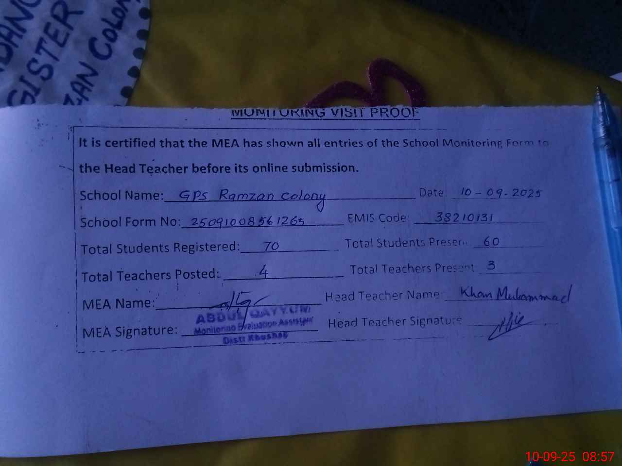 | Attendance Register | Head Teacher | MEA with School | Visit Proof |