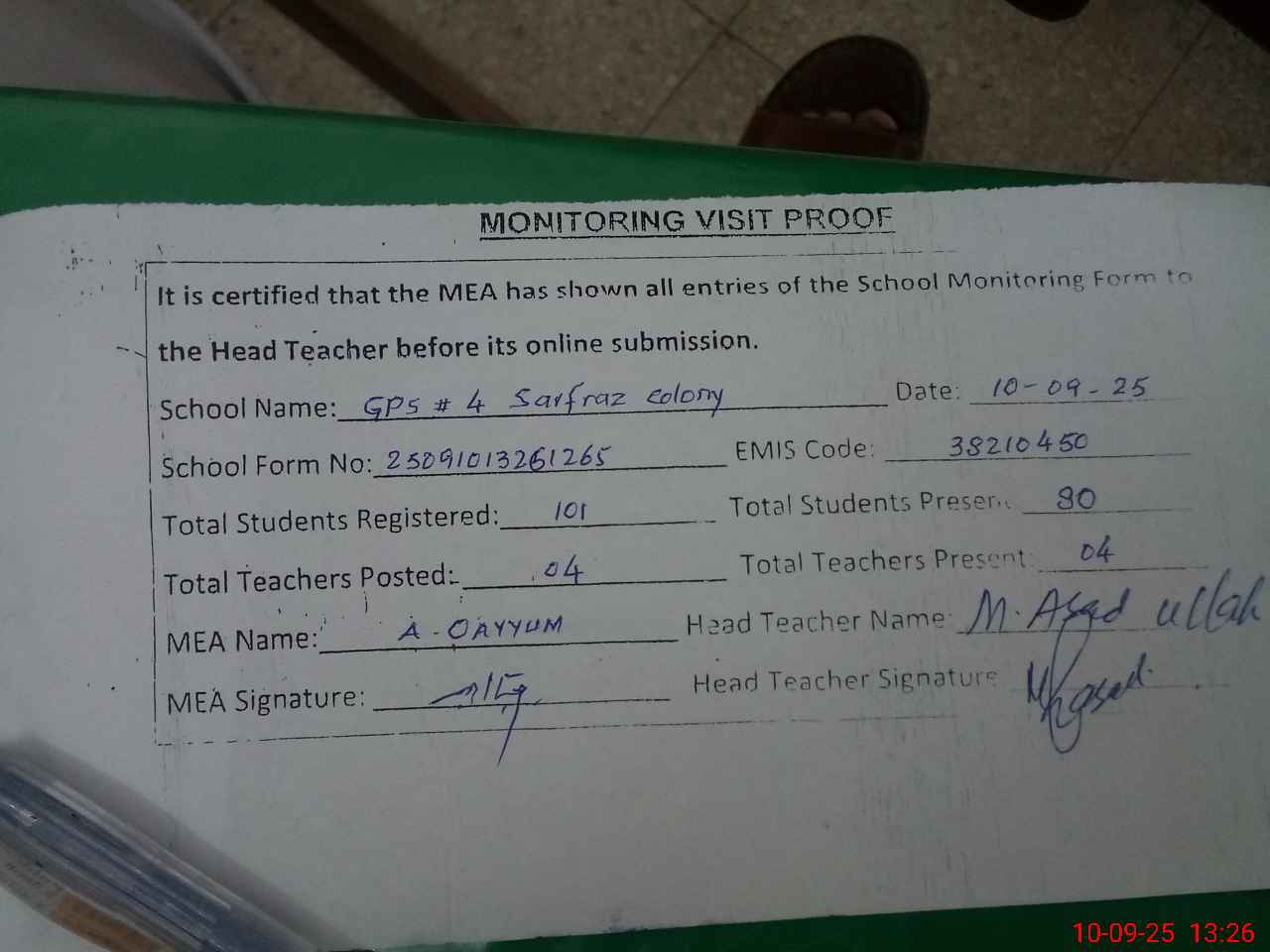 | Attendance Register | Head Teacher | MEA with School | Visit Proof |