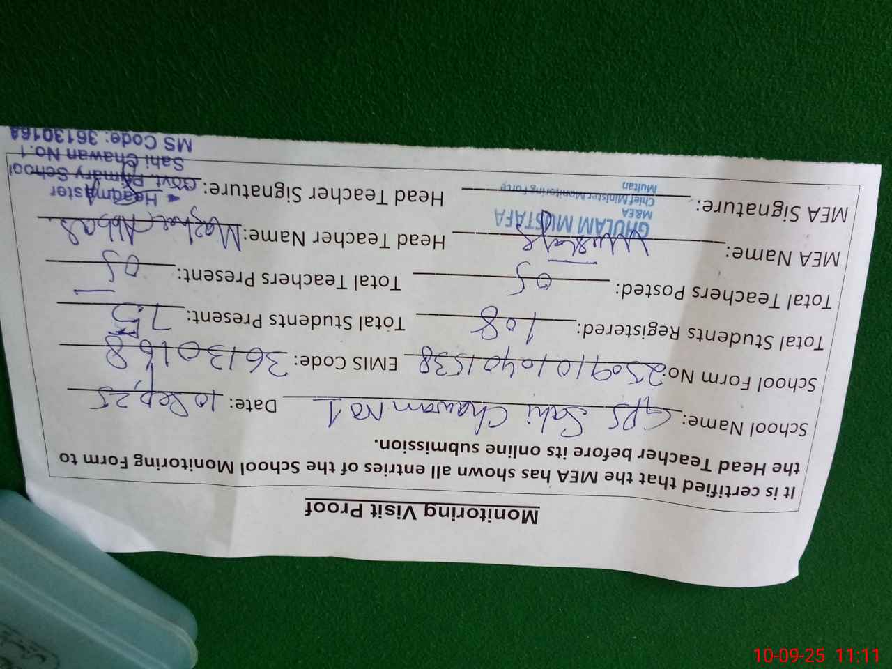 | EMIS Code: 36130168 | Name of School: GPS SAHI CHAWAN NO:1 MULTAN | |||