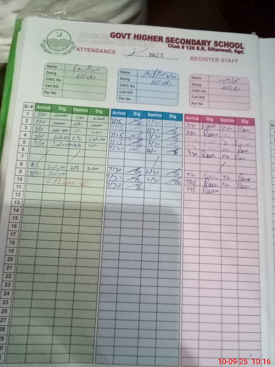 | CNIC | Full Name | Designation | R/C | Absence During Last Calender Month |