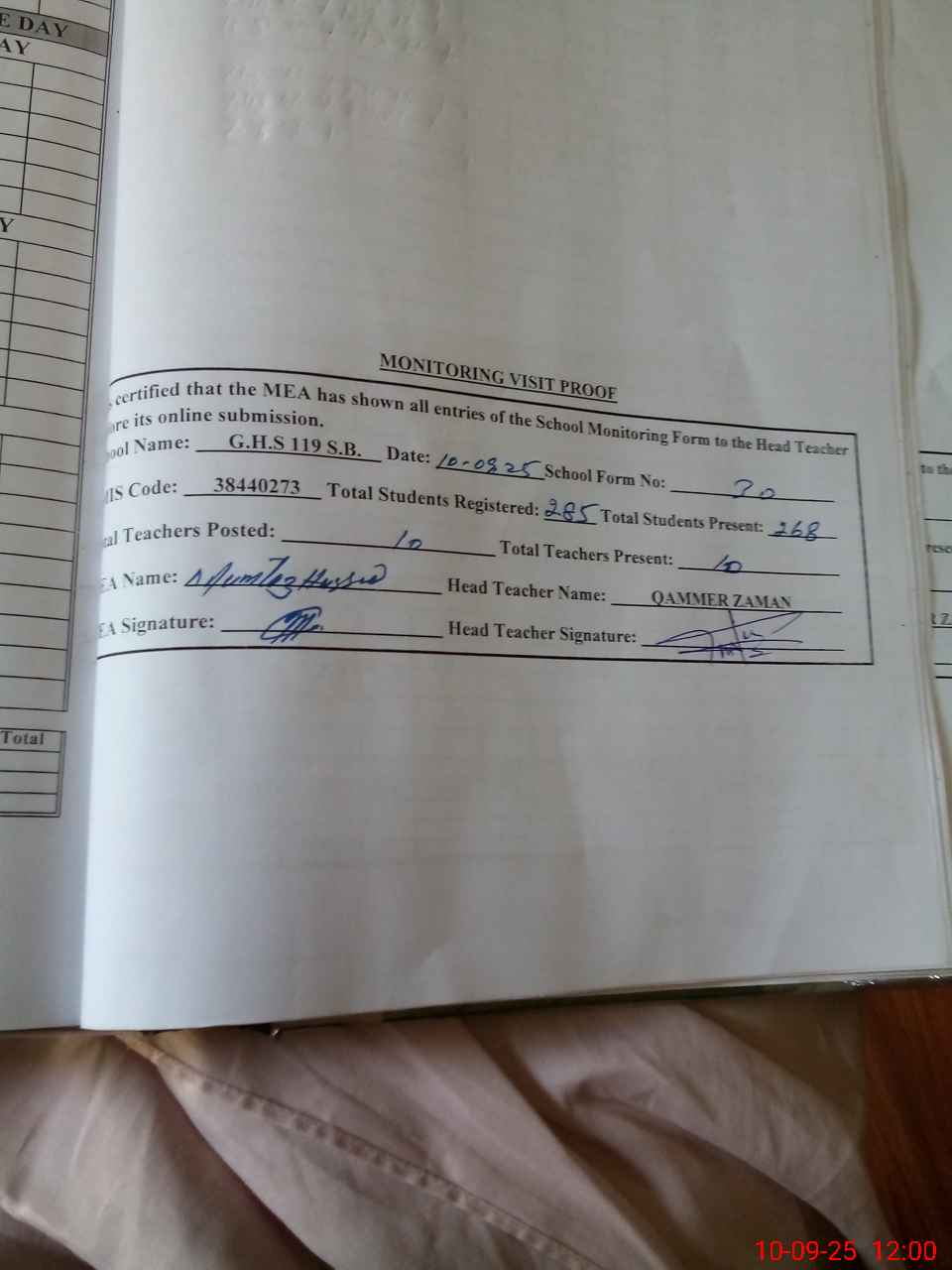 | Attendance Register | Head Teacher | MEA with School | Visit Proof |