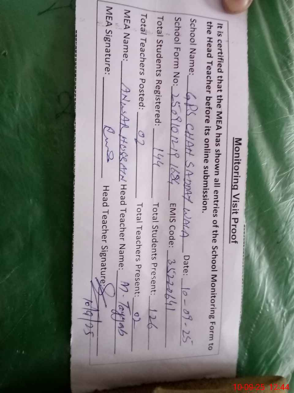 | Attendance Register | Head Teacher | MEA with School | Visit Proof |
