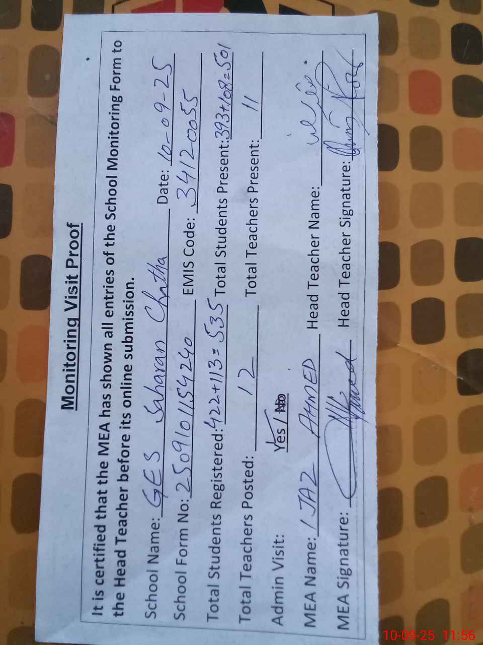 | Attendance Register | Head Teacher | MEA with School | Visit Proof |
