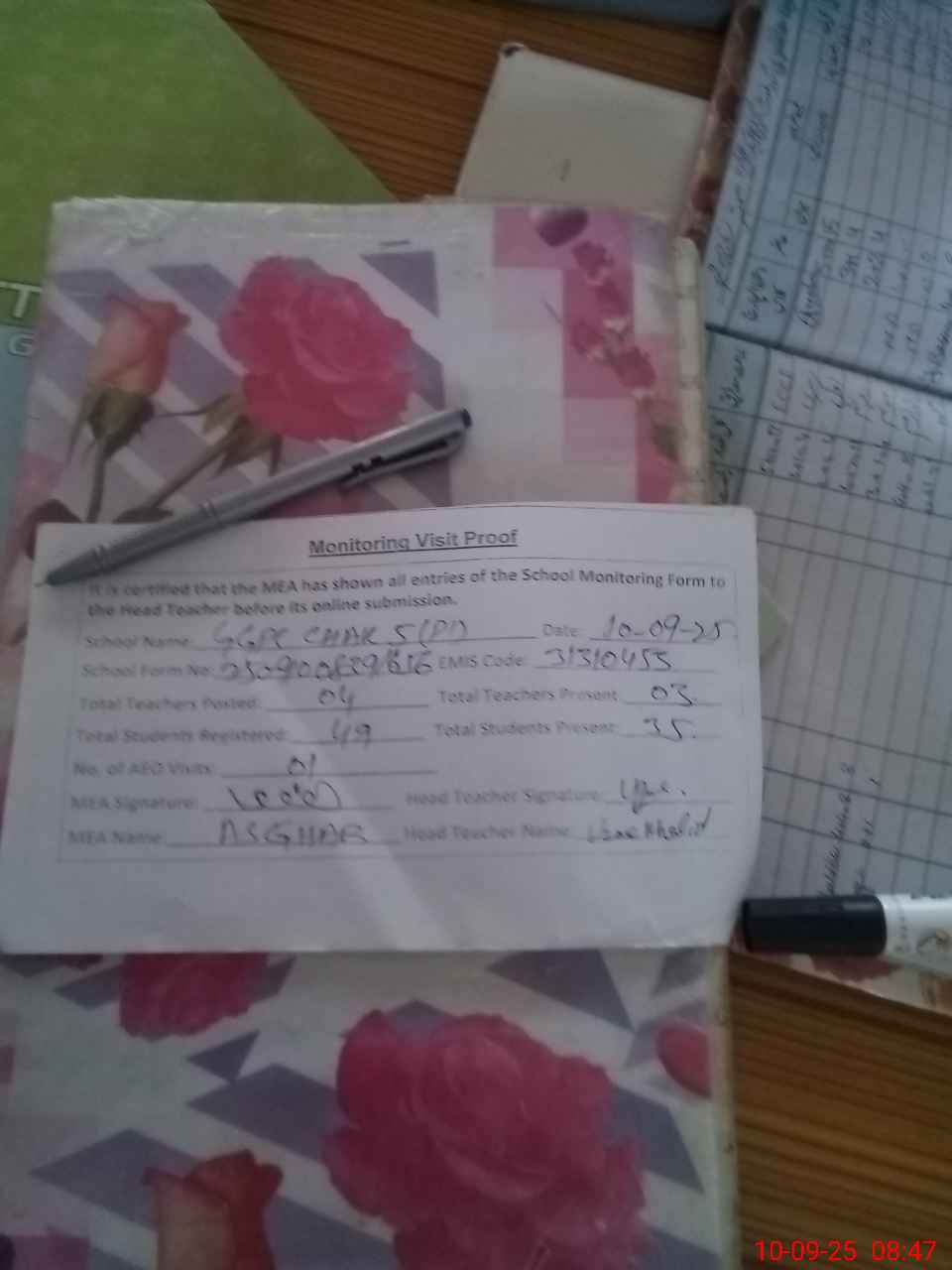 | Attendance Register | Head Teacher | MEA with School | Visit Proof |