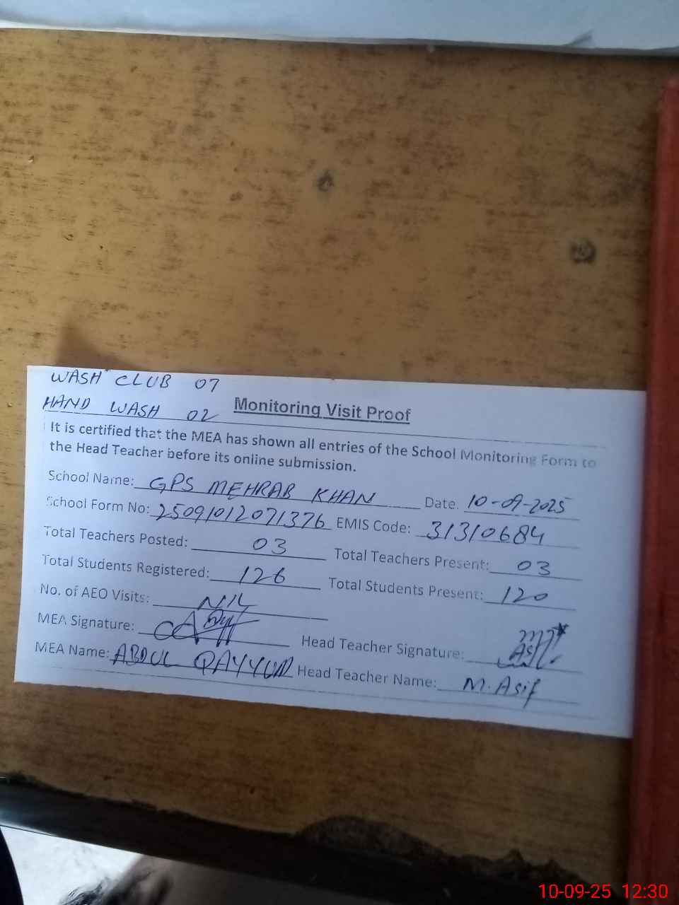 | EMIS Code: 31310684 | Name of School: GPS MEHRAB KHAN | |||