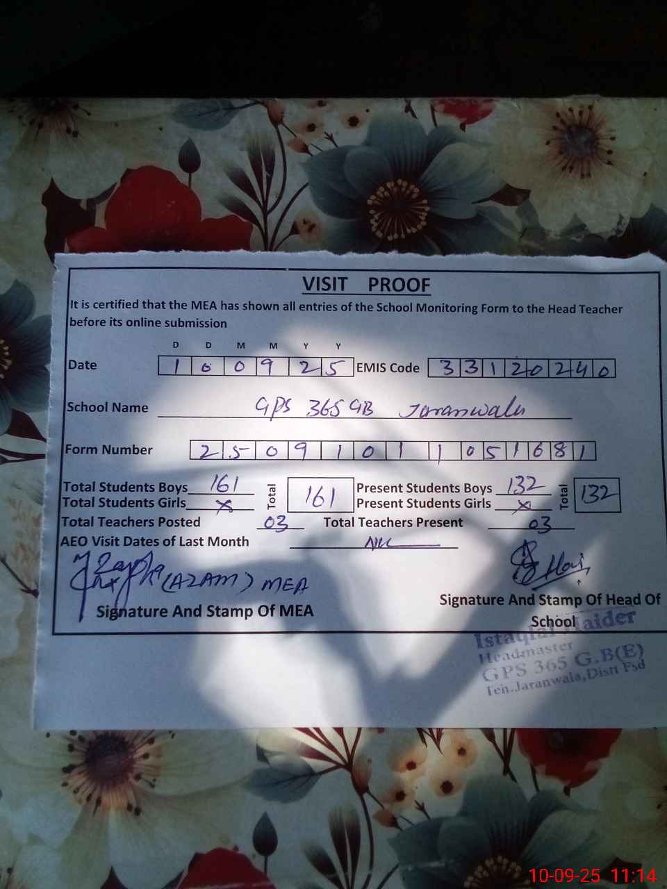 | EMIS Code: 33120240 | Name of School: GPS CHAK 365 GB | |||