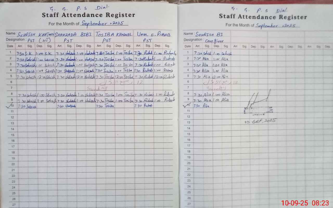 | Total no. of Classrooms: 4 No. of Classrooms Used for Teaching: 4 No. of Classrooms Storing Old Furniture, FTBs, etc: 0Comments if Any: Attendance register not maintained for 03 months June July August NSB record not yet started for current financial year |