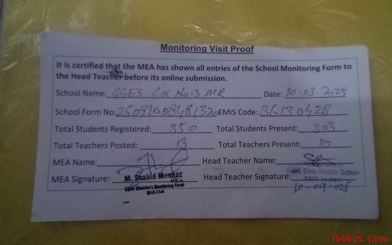 | Monitoring Date: 10-09-2025 | Start Time: 10-09-2025 08:48 AM | End Time: 10-09-2025 10:20 AM | Name of MEA: MU**** SH**** MU**** | |