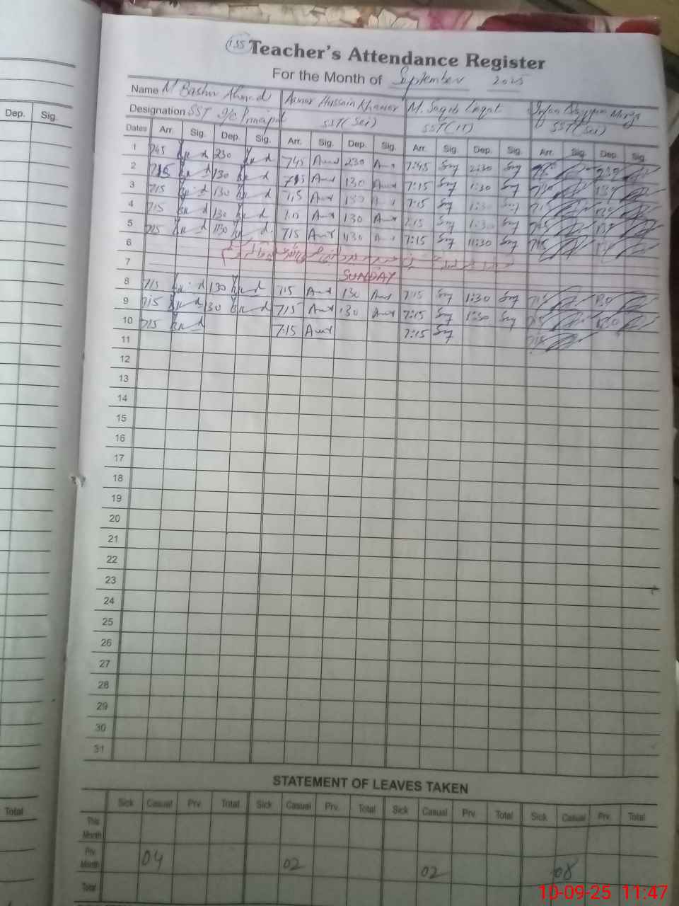 | CNIC | Full Name | Designation | R/C | Absence During Last Calender Month |