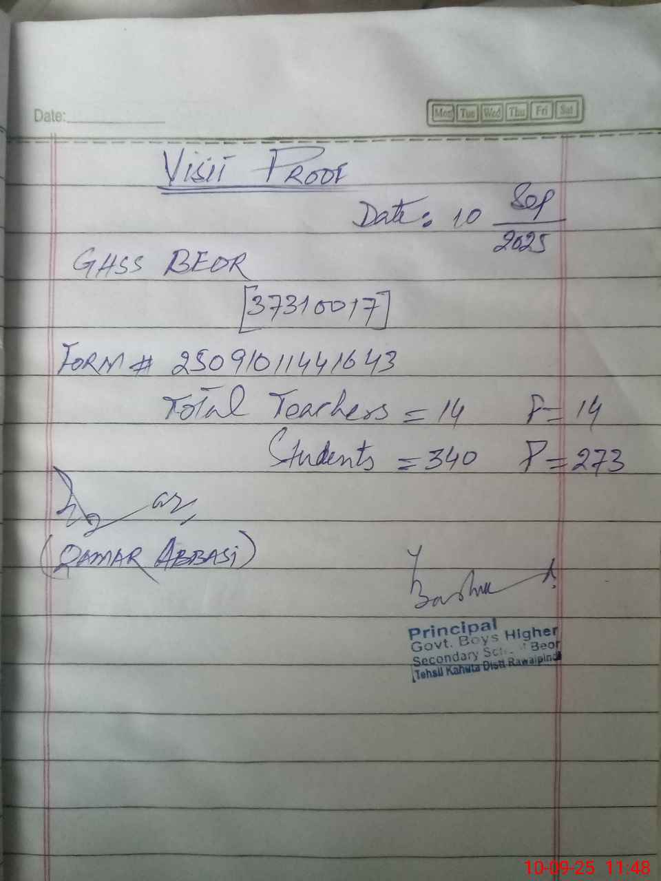 | Attendance Register | Head Teacher | MEA with School | Visit Proof |