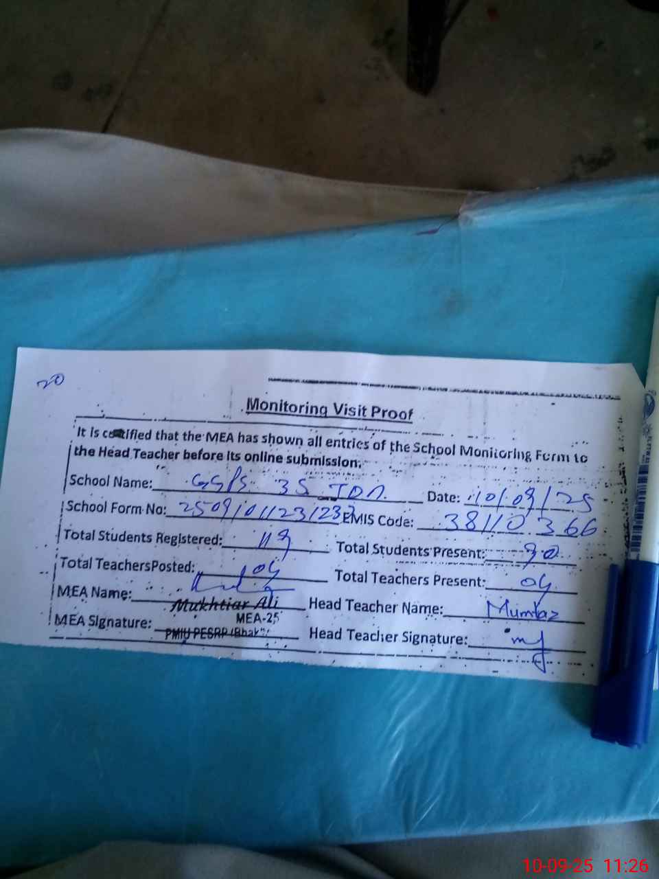| Attendance Register | Head Teacher | MEA with School | Visit Proof |