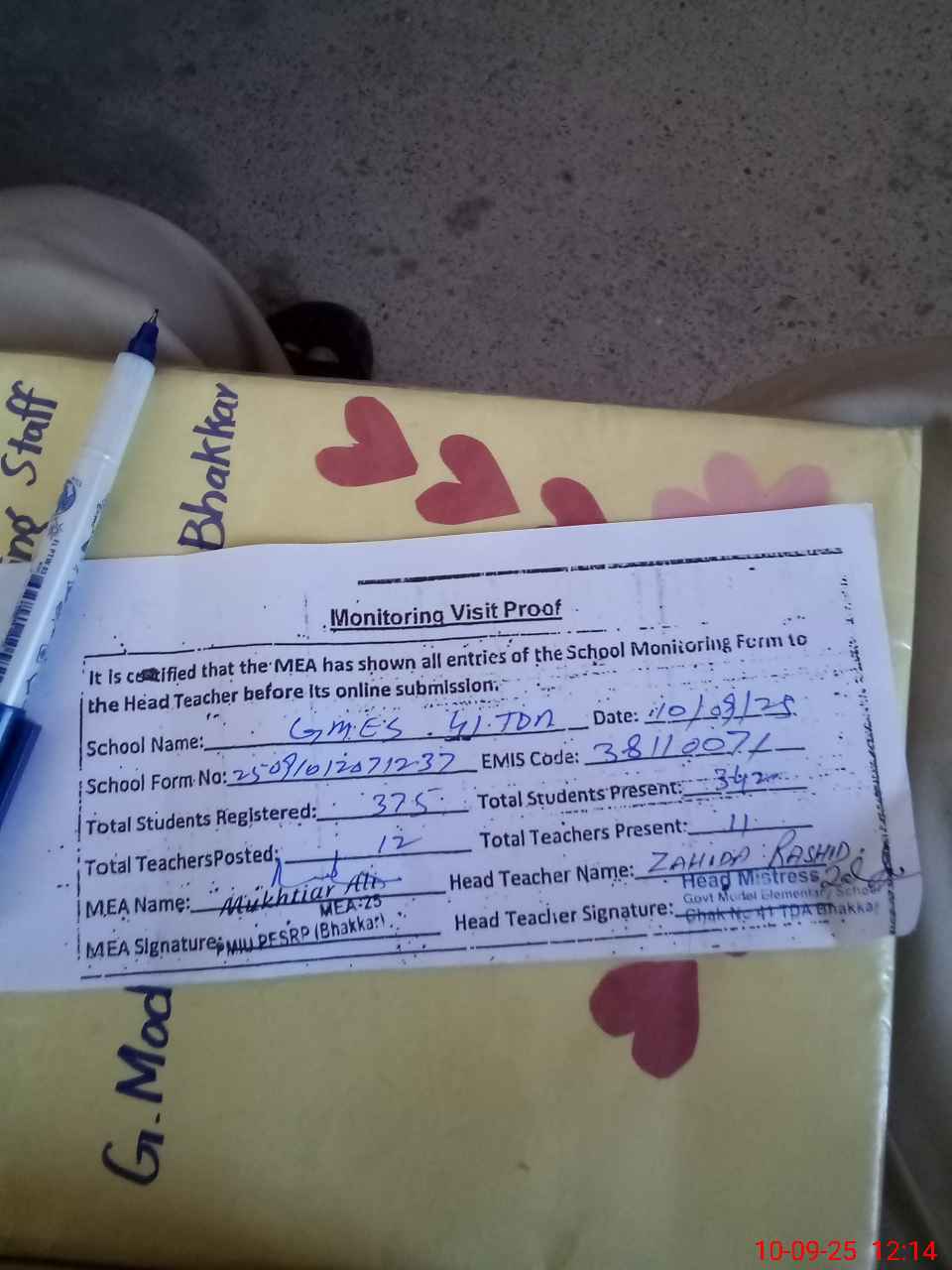 | Certified that this School was Inspected by the Undersigned MEA/DMO Today and the Information Stated Above is as Per Record. | |||||