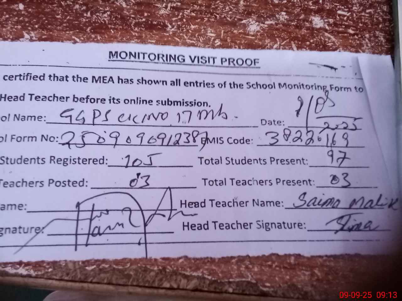 | Attendance Register | Head Teacher | MEA with School | Visit Proof |