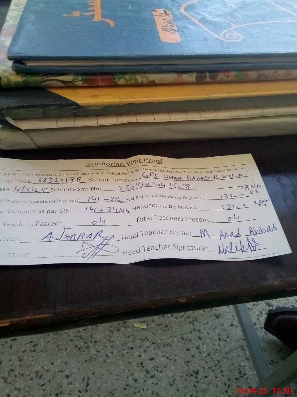 | Attendance Register | Head Teacher | MEA with School | Visit Proof |
