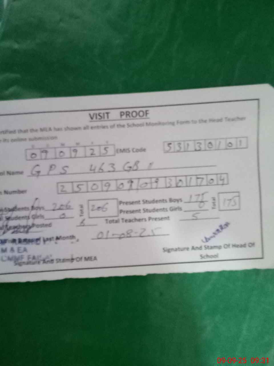 | Attendance Register | Head Teacher | MEA with School | Visit Proof |