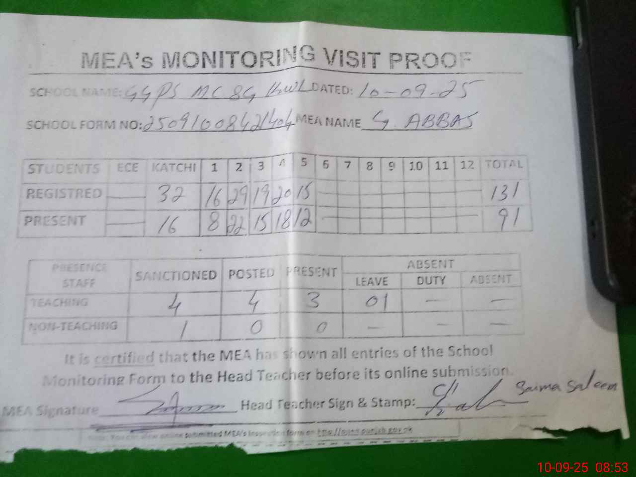 | Attendance Register | Head Teacher | MEA with School | Visit Proof |