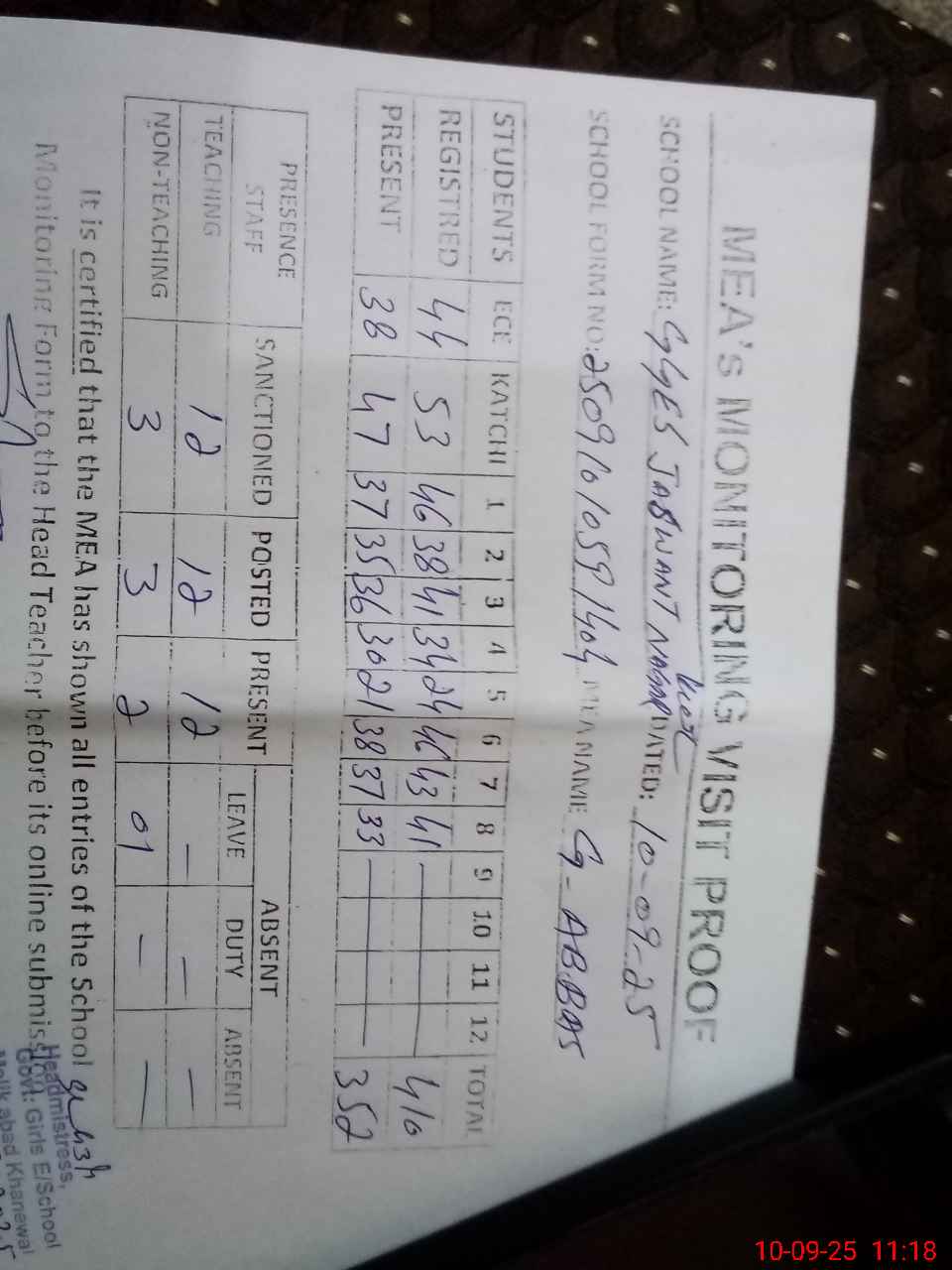 | Certified that this School was Inspected by the Undersigned MEA/DMO Today and the Information Stated Above is as Per Record. | |||||