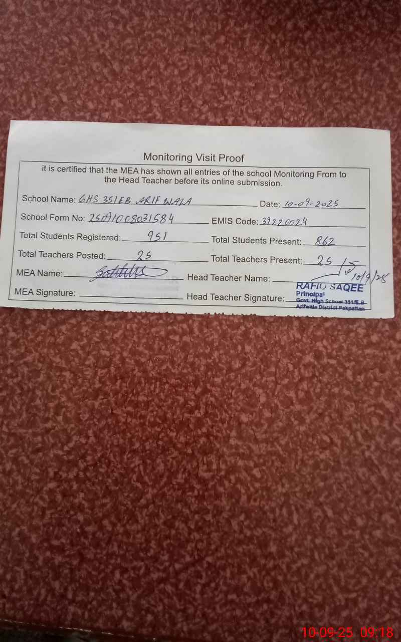 | EMIS Code: 39220024 | Name of School: GHS 351/EB ARIFWALA | |||