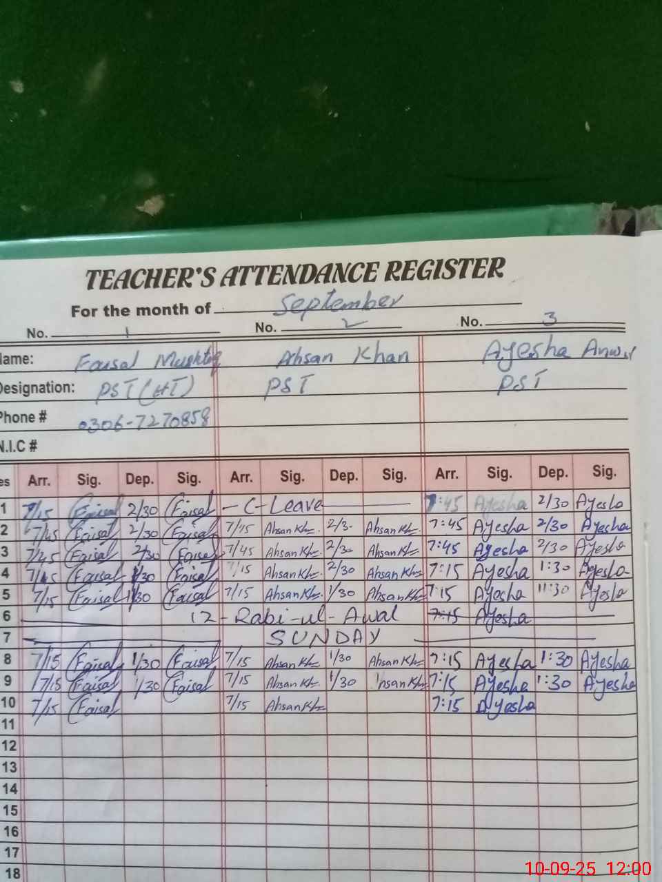 | CNIC | Full Name | Designation | R/C | Absence During Last Calender Month |