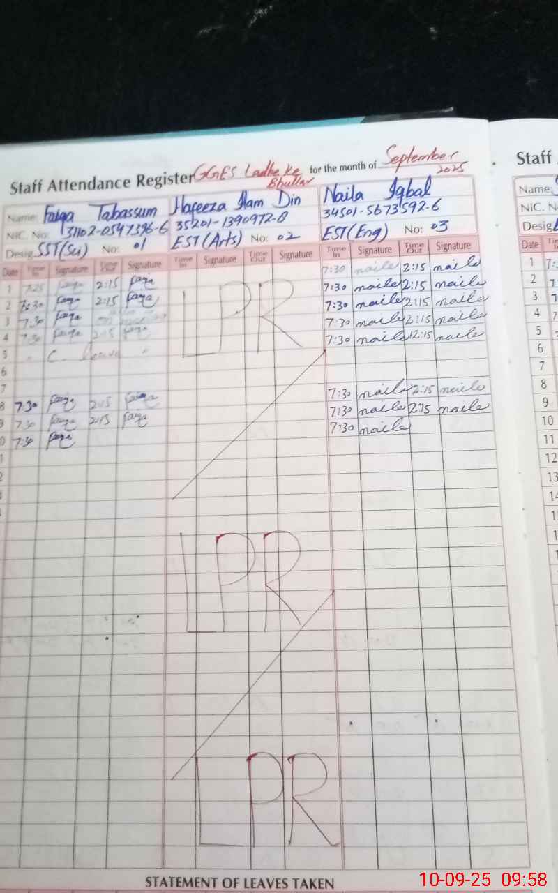 | Remarks (Use Separate Page if Required): Teacher Hafeeza is on LPR since 04 April 2025 showing on teachers list | |||||