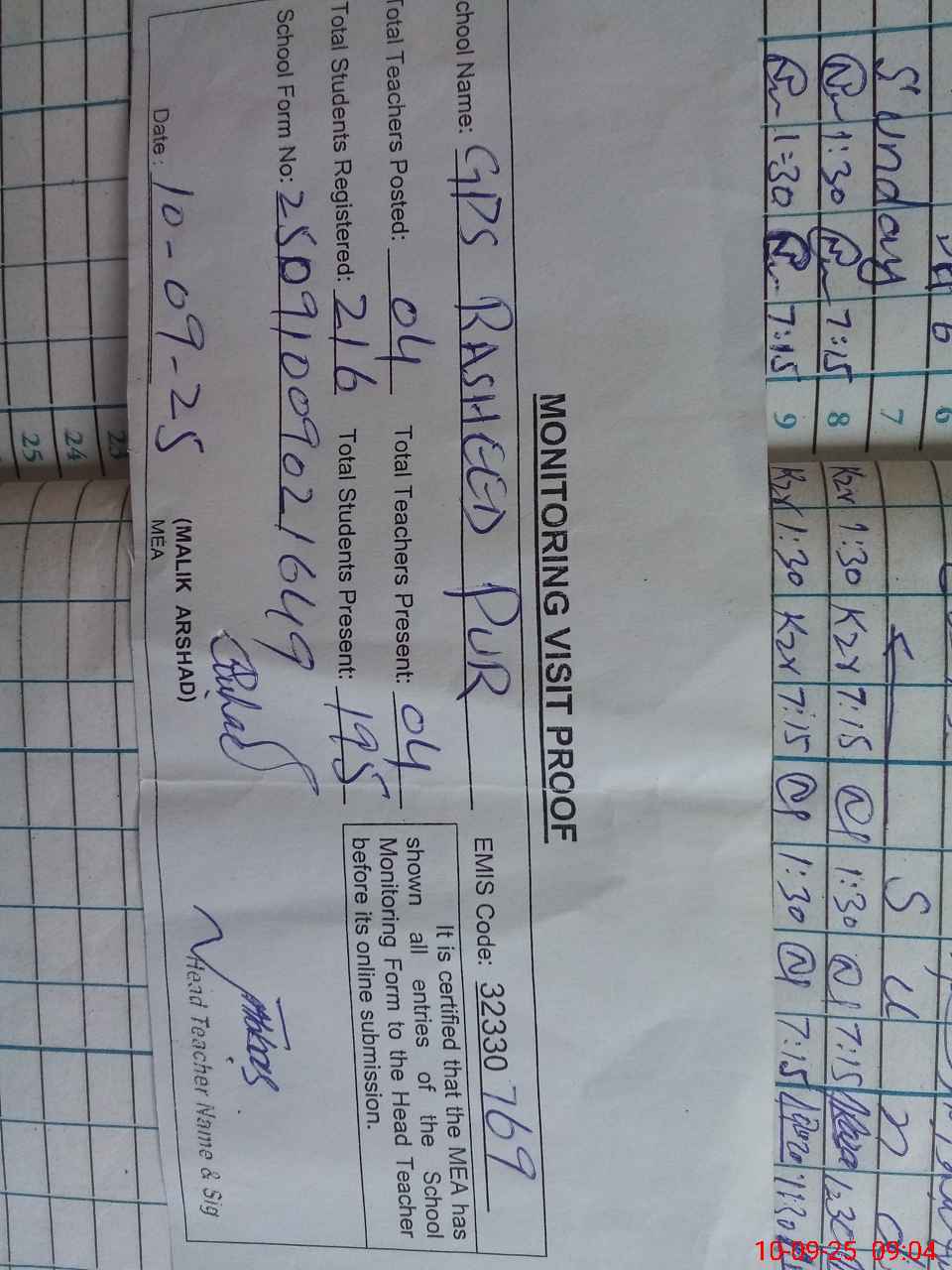 | EMIS Code: 32330769 | Name of School: GPS RASHEED PUR | |||