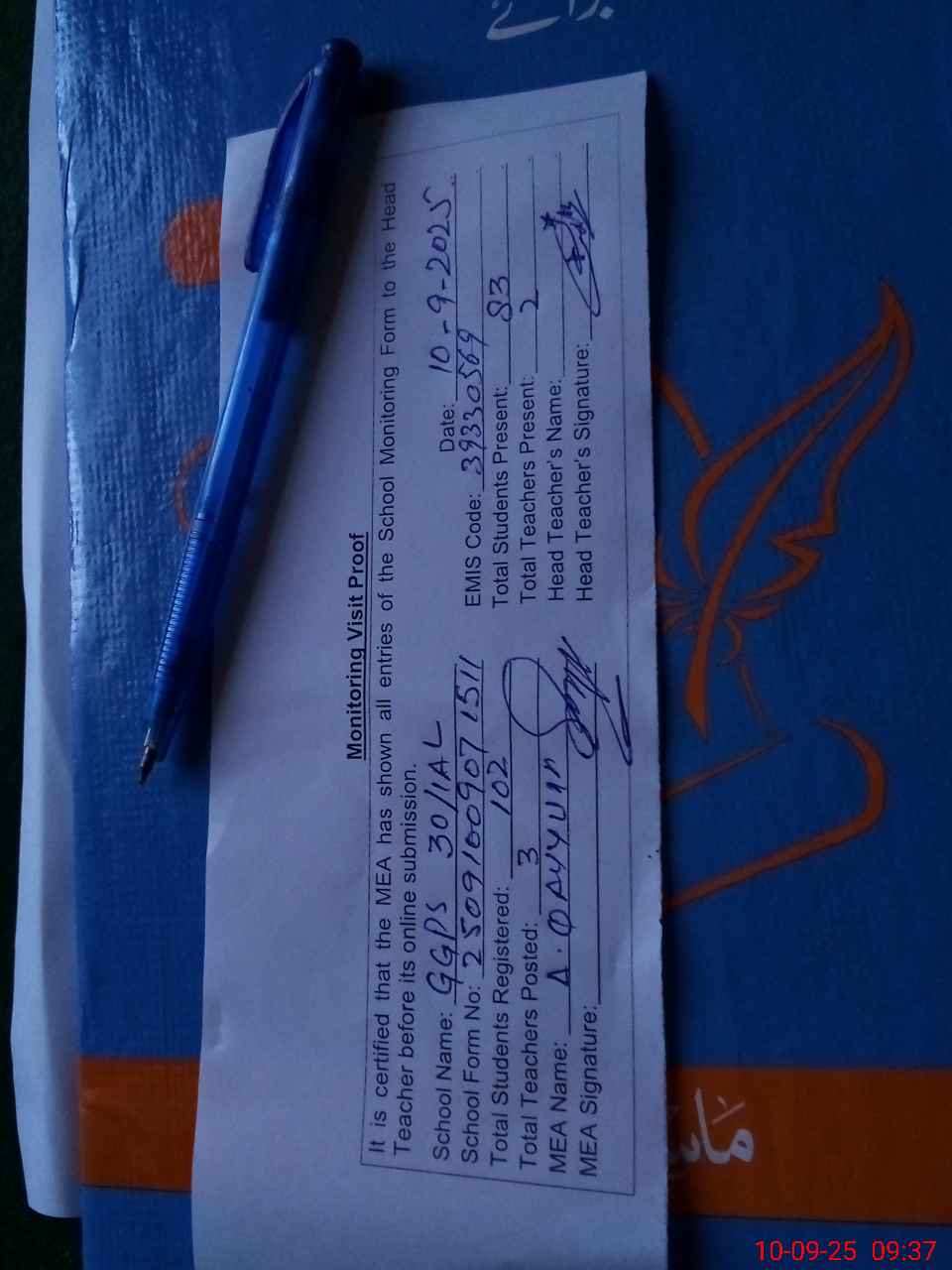 | Attendance Register | Head Teacher | MEA with School | Visit Proof |