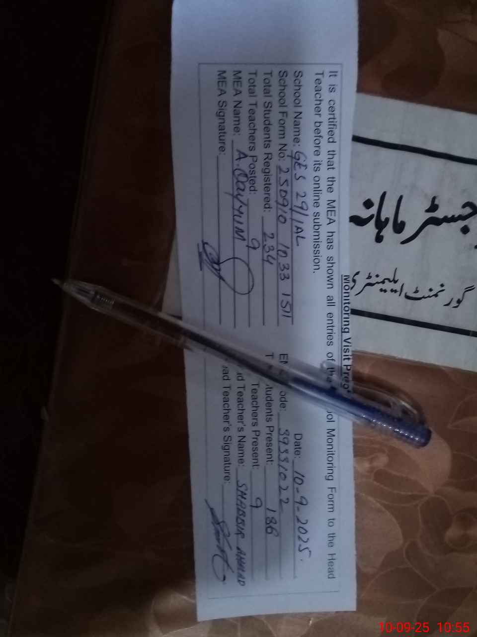 | Certified that this School was Inspected by the Undersigned MEA/DMO Today and the Information Stated Above is as Per Record. | |||||