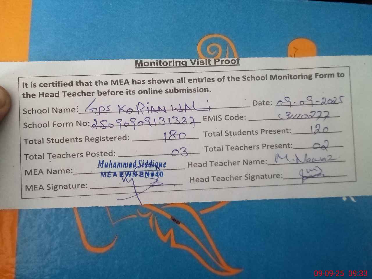 | EMIS Code: 31110277 | Name of School: GPS KORIAN WALI | |||