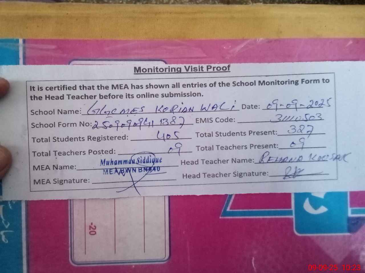 | EMIS Code: 31110503 | Name of School: GGMES KORIAN WALI | |||