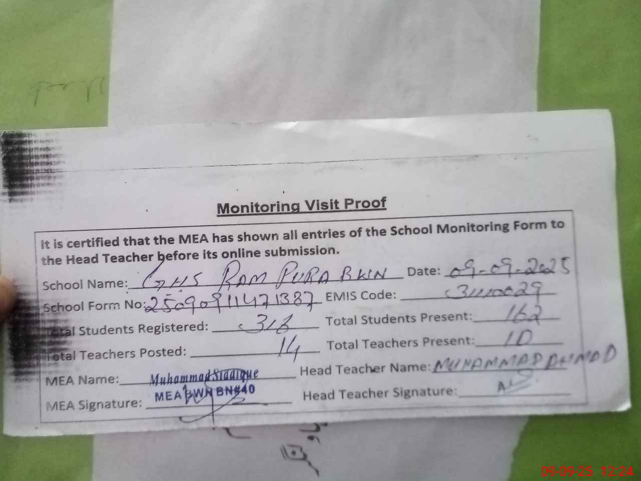 | Attendance Register | Head Teacher | MEA with School | Visit Proof |