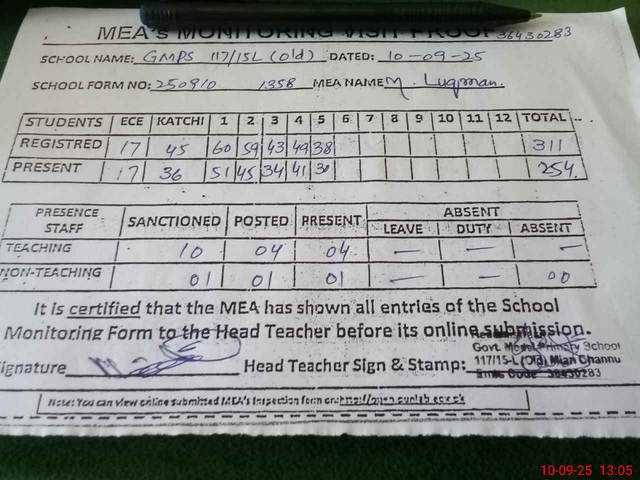 | EMIS Code: 36430283 | Name of School: GMES 117/15-L OLD, MIAN CHANNU | |||