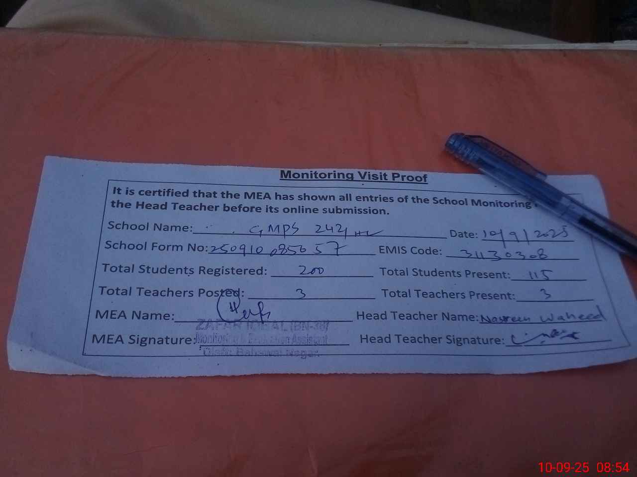 | Monitoring Date: 10-09-2025 | Start Time: 10-09-2025 08:22 AM | End Time: 10-09-2025 08:54 AM | Name of MEA: Za**** Iq**** BN**** | |