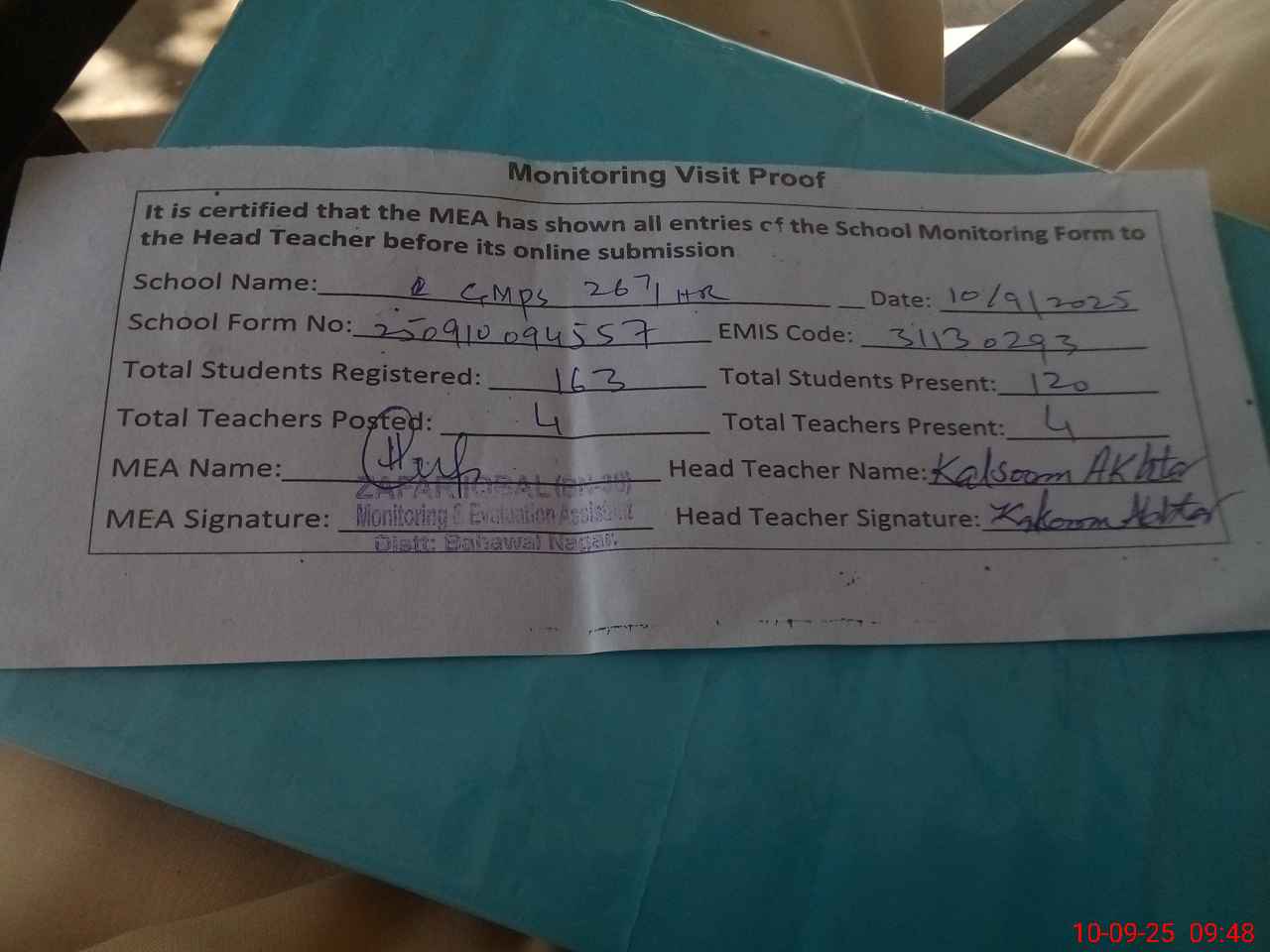 | Monitoring Date: 10-09-2025 | Start Time: 10-09-2025 09:29 AM | End Time: 10-09-2025 09:49 AM | Name of MEA: Za**** Iq**** BN**** | |