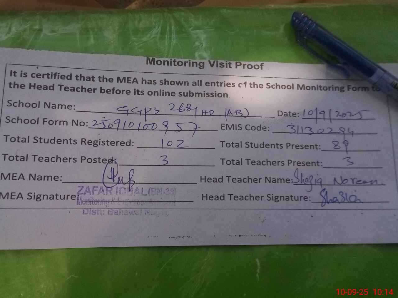 | Monitoring Date: 10-09-2025 | Start Time: 10-09-2025 10:02 AM | End Time: 10-09-2025 10:14 AM | Name of MEA: Za**** Iq**** BN**** | |