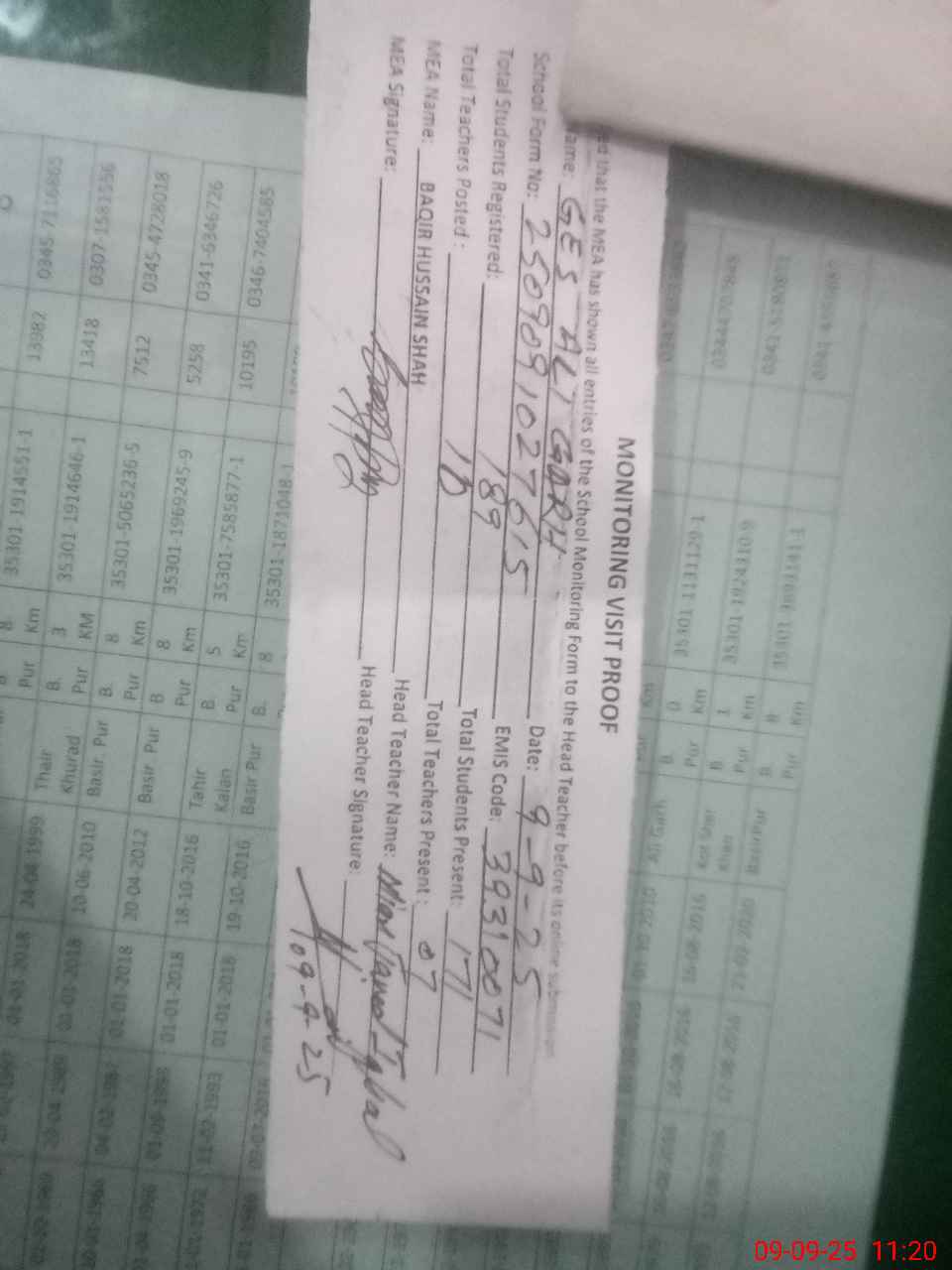 | Attendance Register | Head Teacher | MEA with School | Visit Proof |