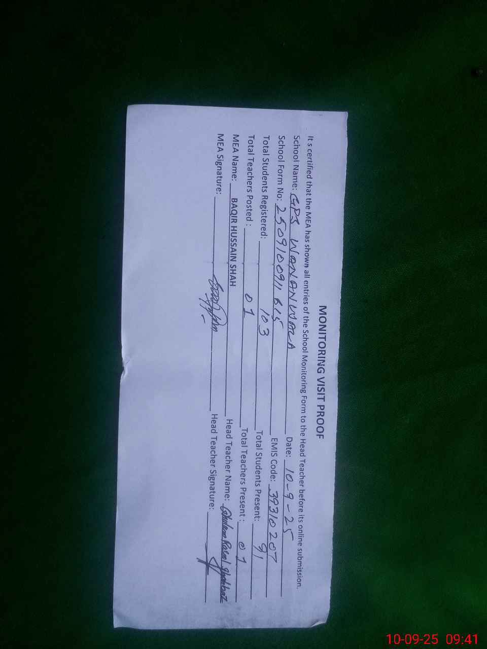 | Remarks (Use Separate Page if Required): Water pump and electric fans have been stolen fir registered visited by dy Deo and seen the condition of dangerous building and also informed about theft case to the higher authorities no water source available so toilets can not be used NSB has been stoped since last year | |||||