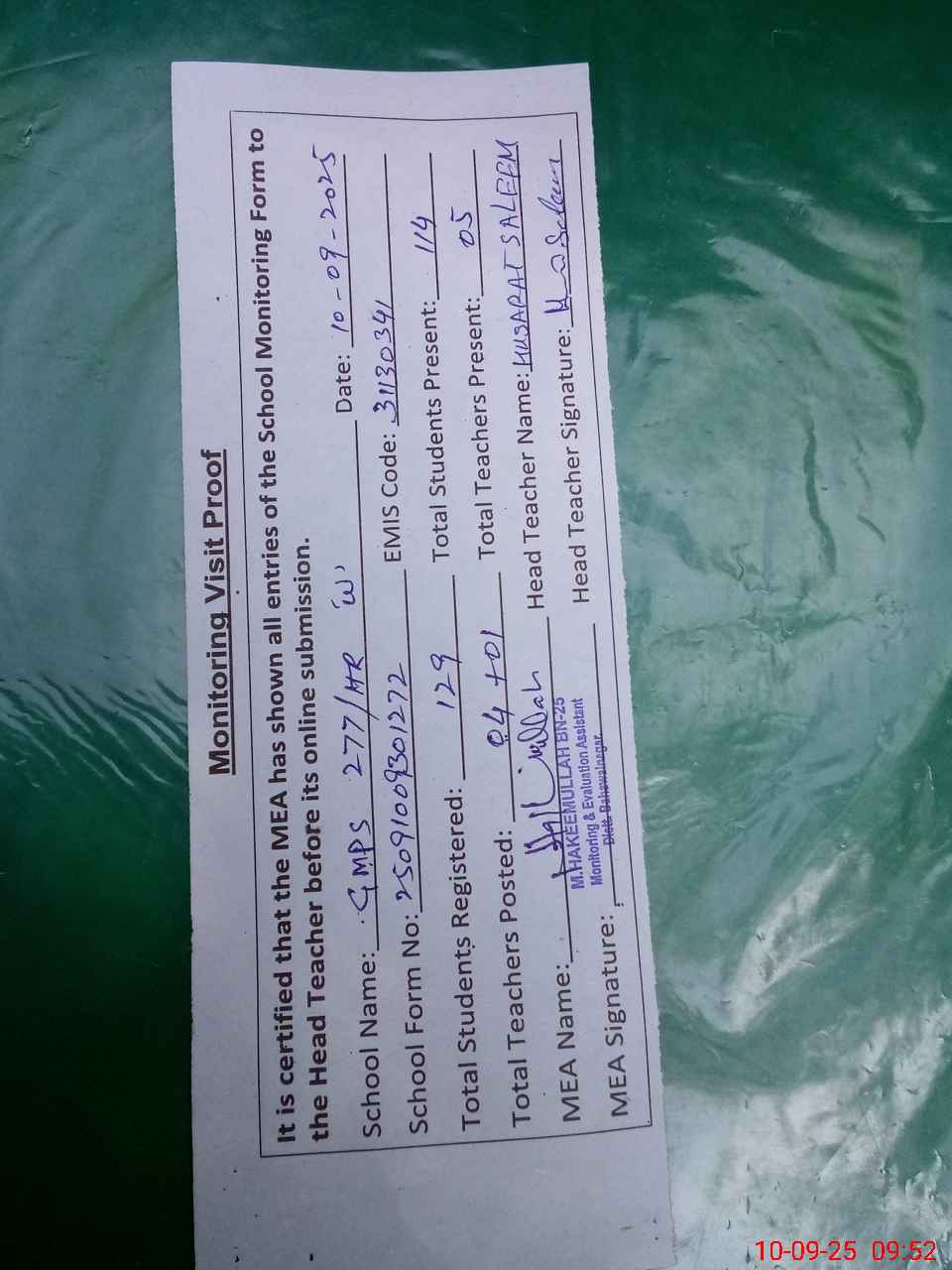 | EMIS Code: 31130341 | Name of School: GMPS CHAK NO 277 HR W | |||