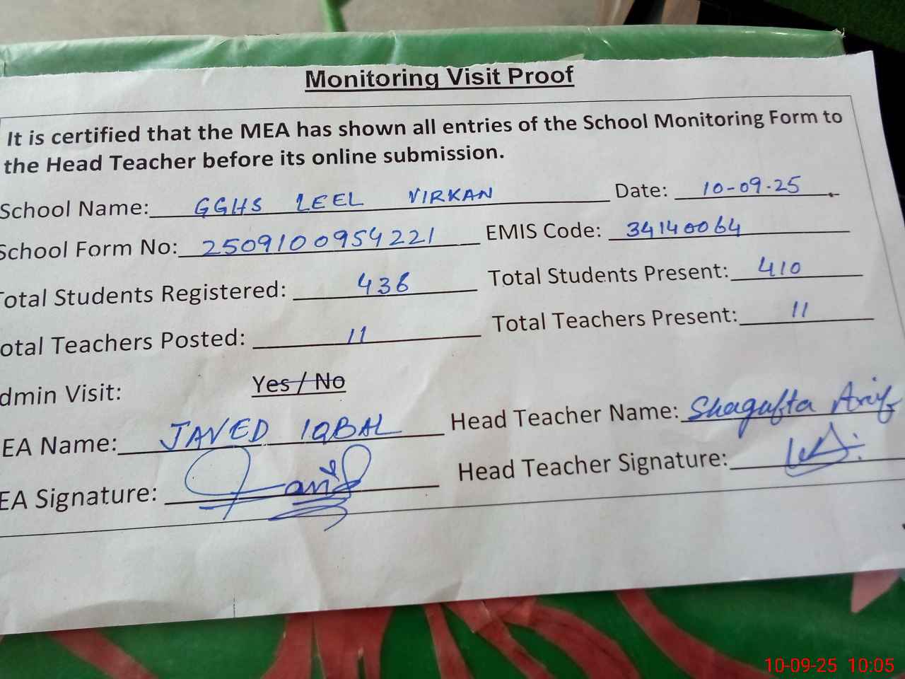 | Attendance Register | Head Teacher | MEA with School | Visit Proof |