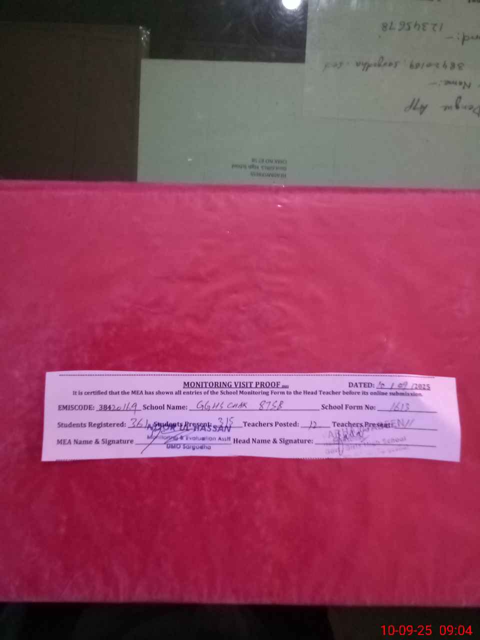 | Certified that this School was Inspected by the Undersigned MEA/DMO Today and the Information Stated Above is as Per Record. | |||||