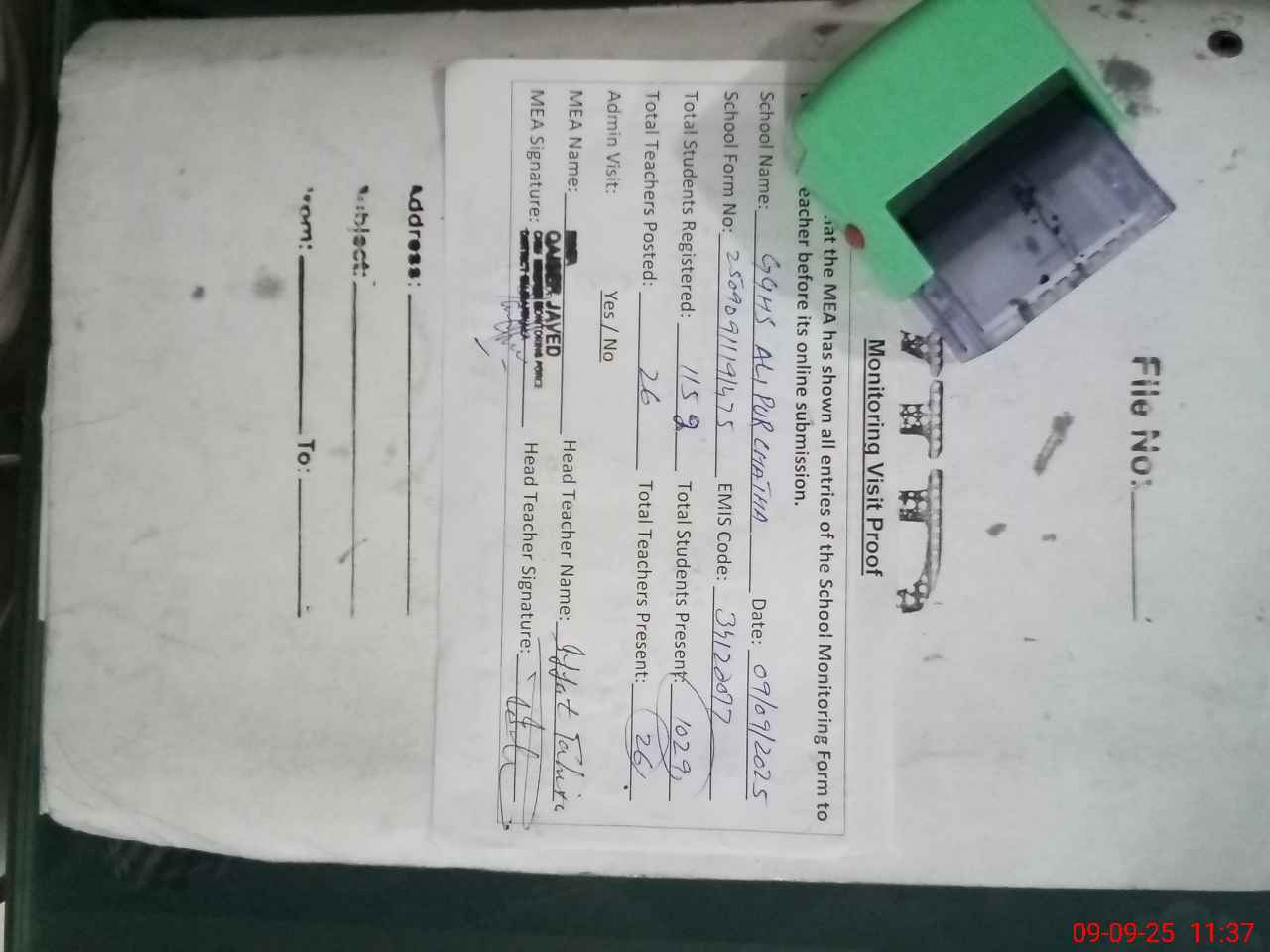 | Attendance Register | Head Teacher | MEA with School | Visit Proof |