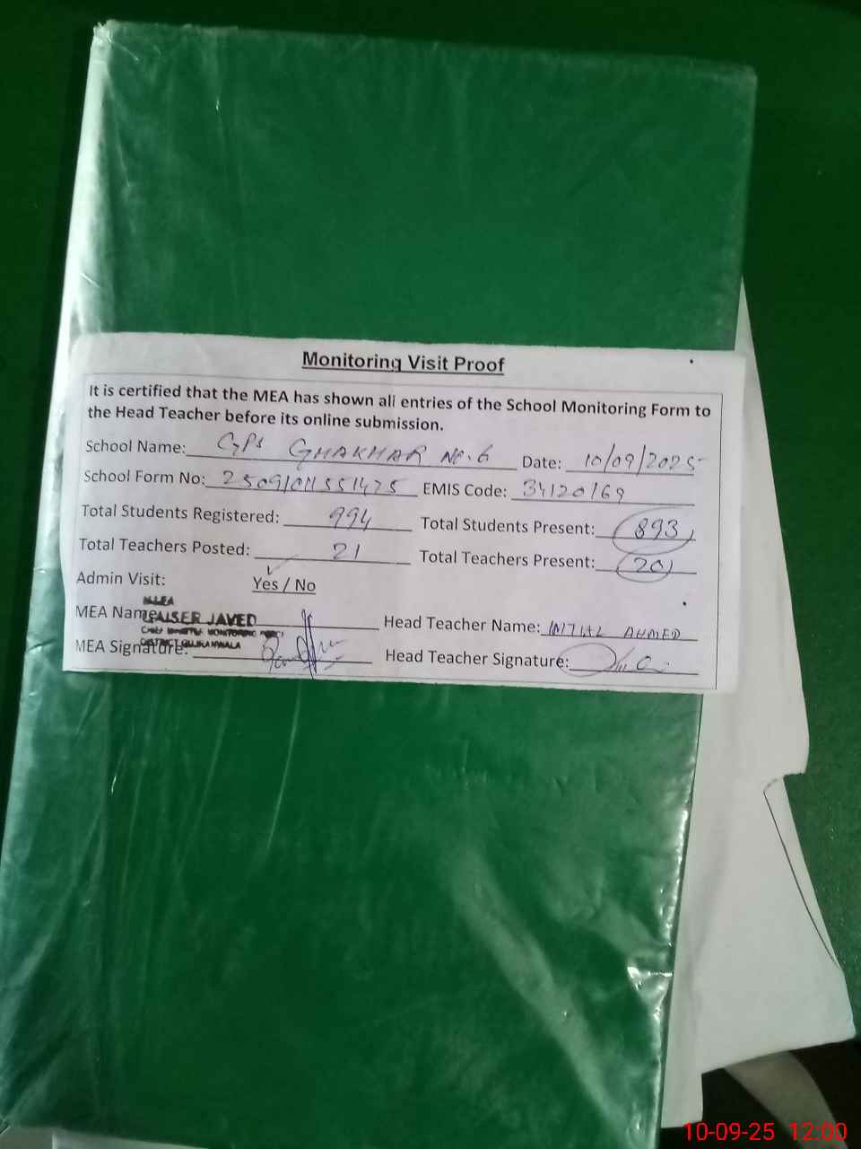 | Attendance Register | Head Teacher | MEA with School | Visit Proof |