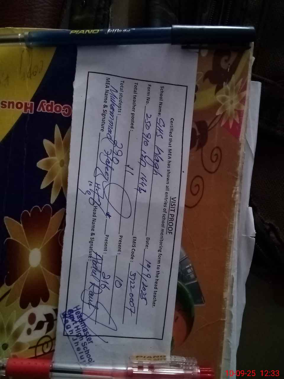| Total no. of Classrooms: 17 No. of Classrooms Used for Teaching: 6 No. of Classrooms Storing Old Furniture, FTBs, etc: 0Comments if Any: Sir NSB and FTF record not shown on on a paper noted Head teacher Abdul Rauf said you not check about community classes During visit at 1135 hrs community classes are running and regular EST teacher Ghulam Mustafa attend the period According instruct |