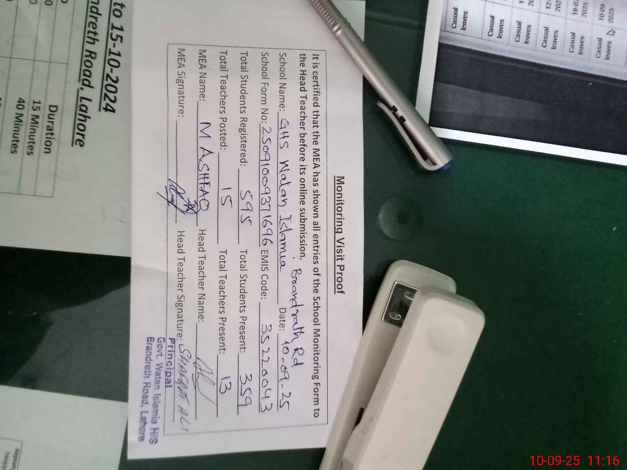 | Remarks (Use Separate Page if Required): SST Muhammad Hanif retired from 12 September 2023 but his name still shown on SIS Principal Amir Mehmood applied casual leave for today but still awaiting for approval from DEO so mark him absent SST Shahbaz Zafar shown as casual leave on attendances register but leave not shown in soft form so mark him absent 35220043 | |||||