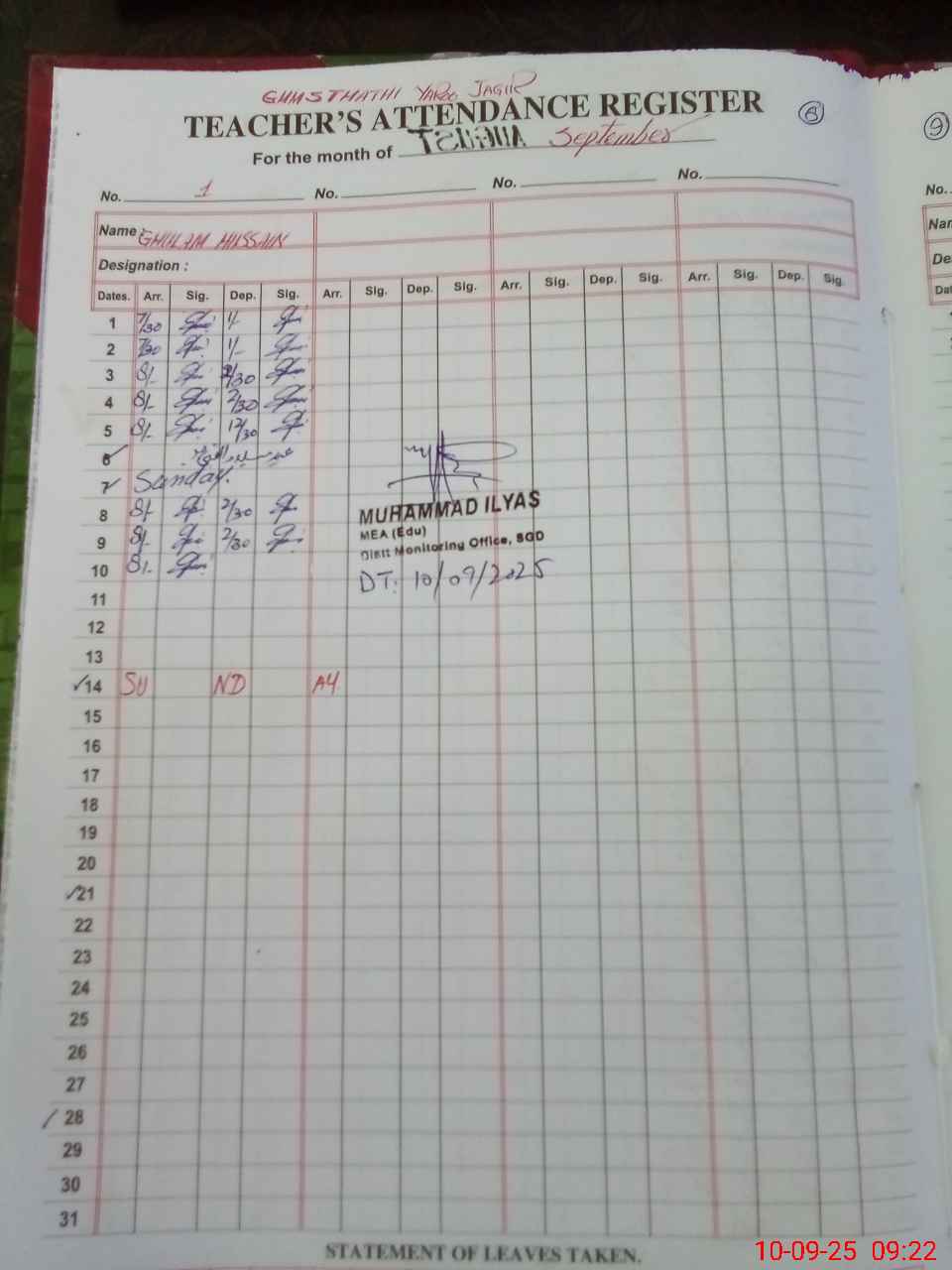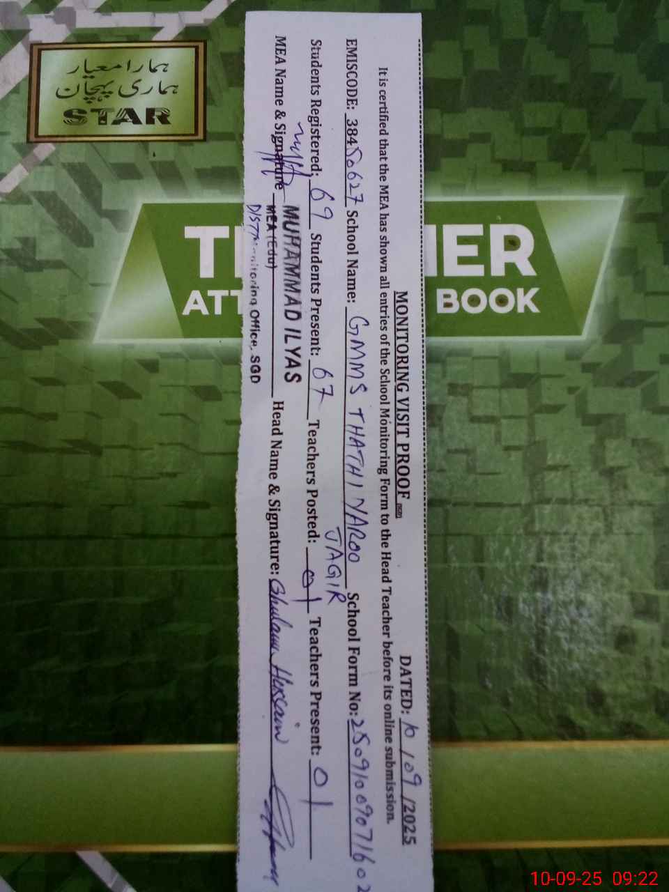 | Attendance Register | Head Teacher | MEA with School | Visit Proof |