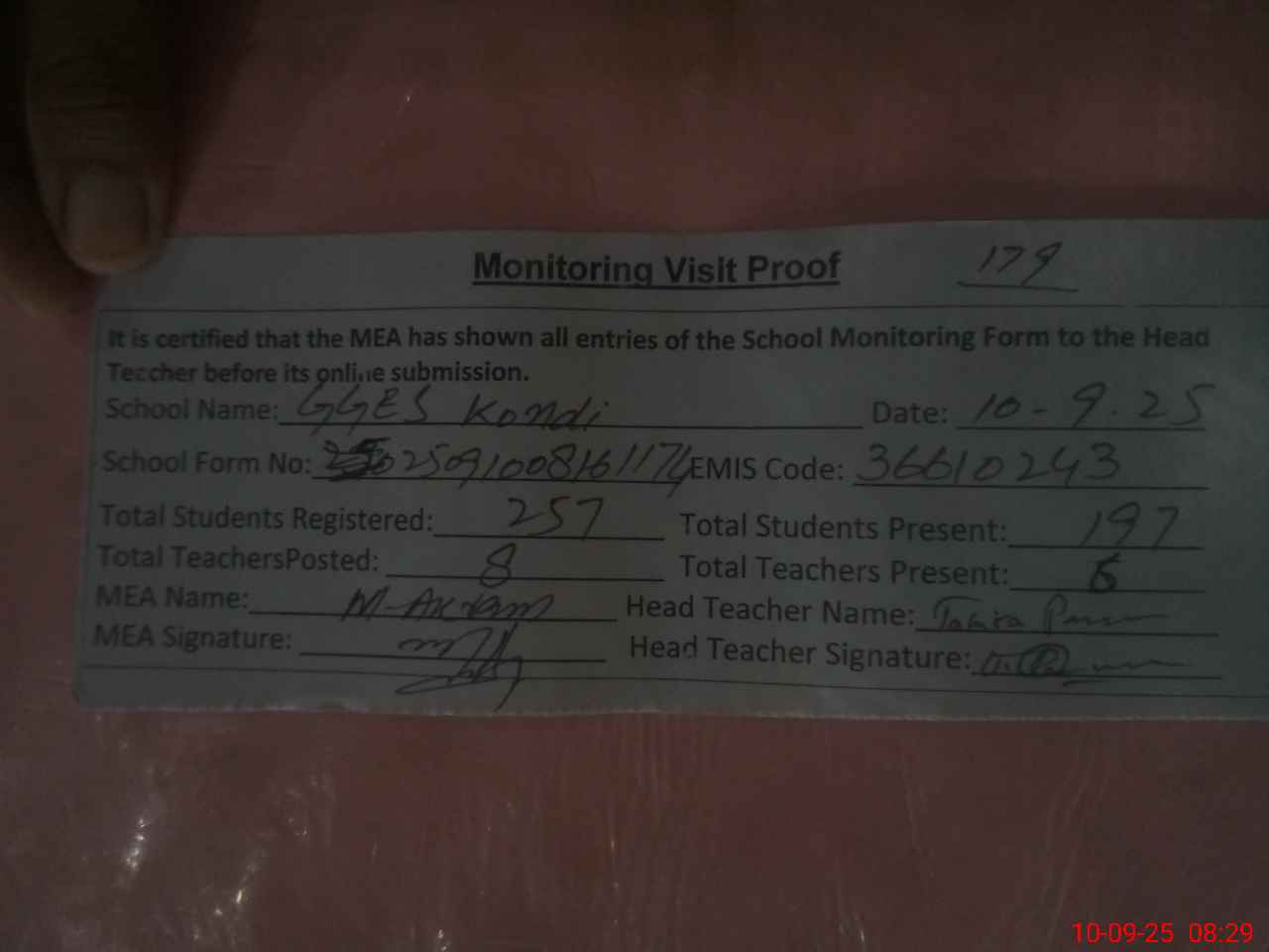 | Attendance Register | Head Teacher | MEA with School | Visit Proof |