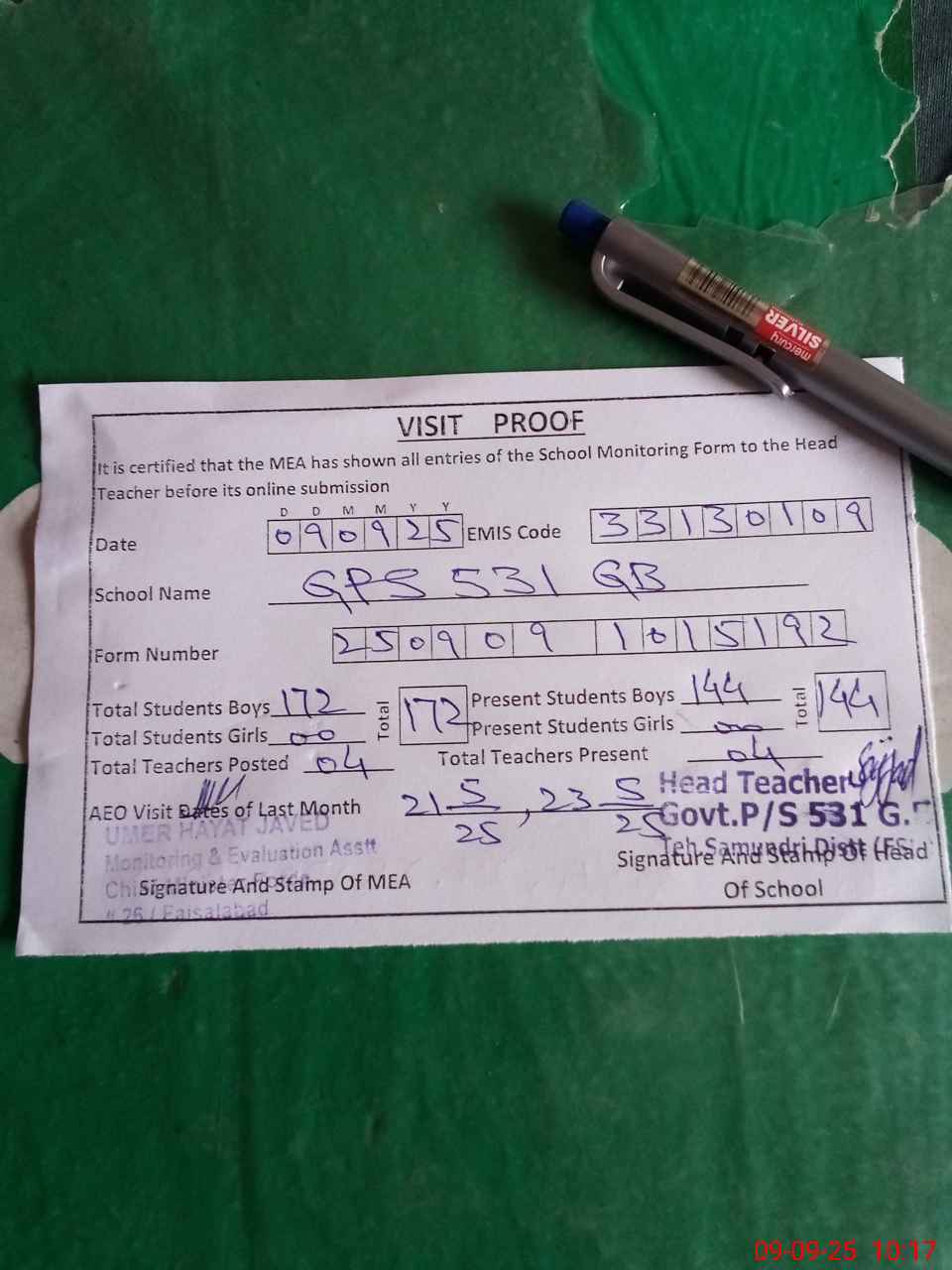 | Attendance Register | Head Teacher | MEA with School | Visit Proof |