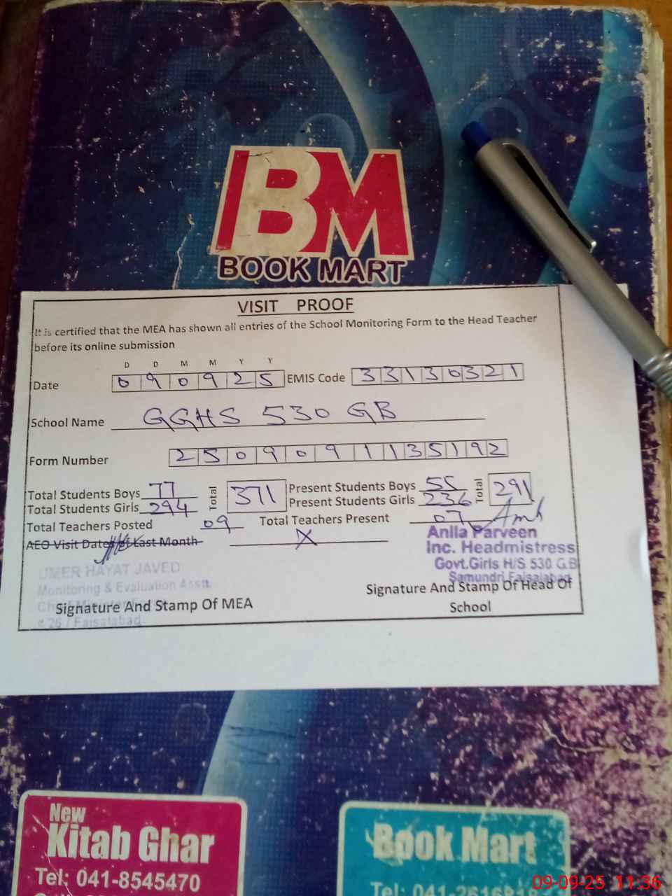 | Attendance Register | Head Teacher | MEA with School | Visit Proof |