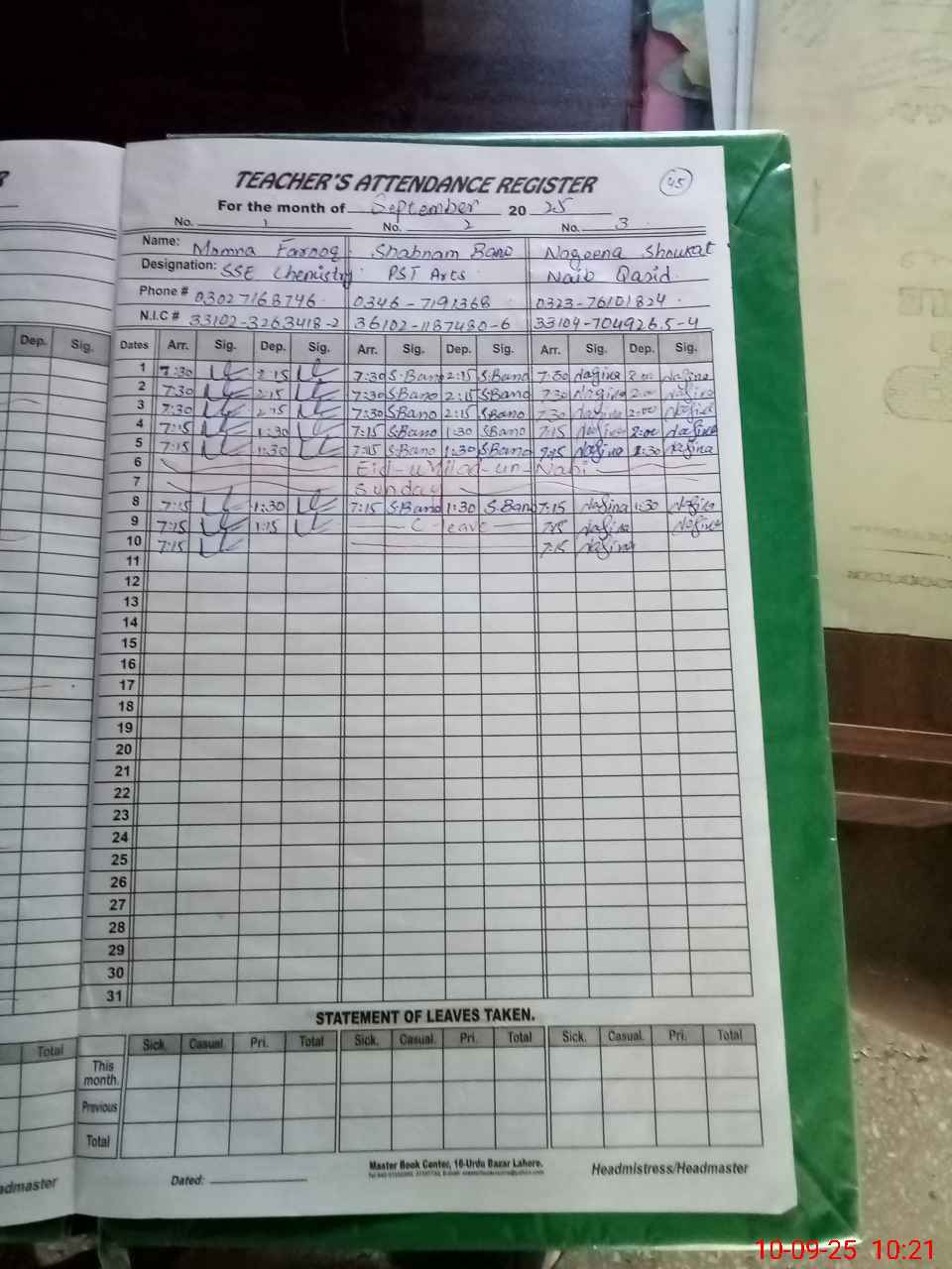 | CNIC | Full Name | Designation | R/C | Absence During Last Calender Month |