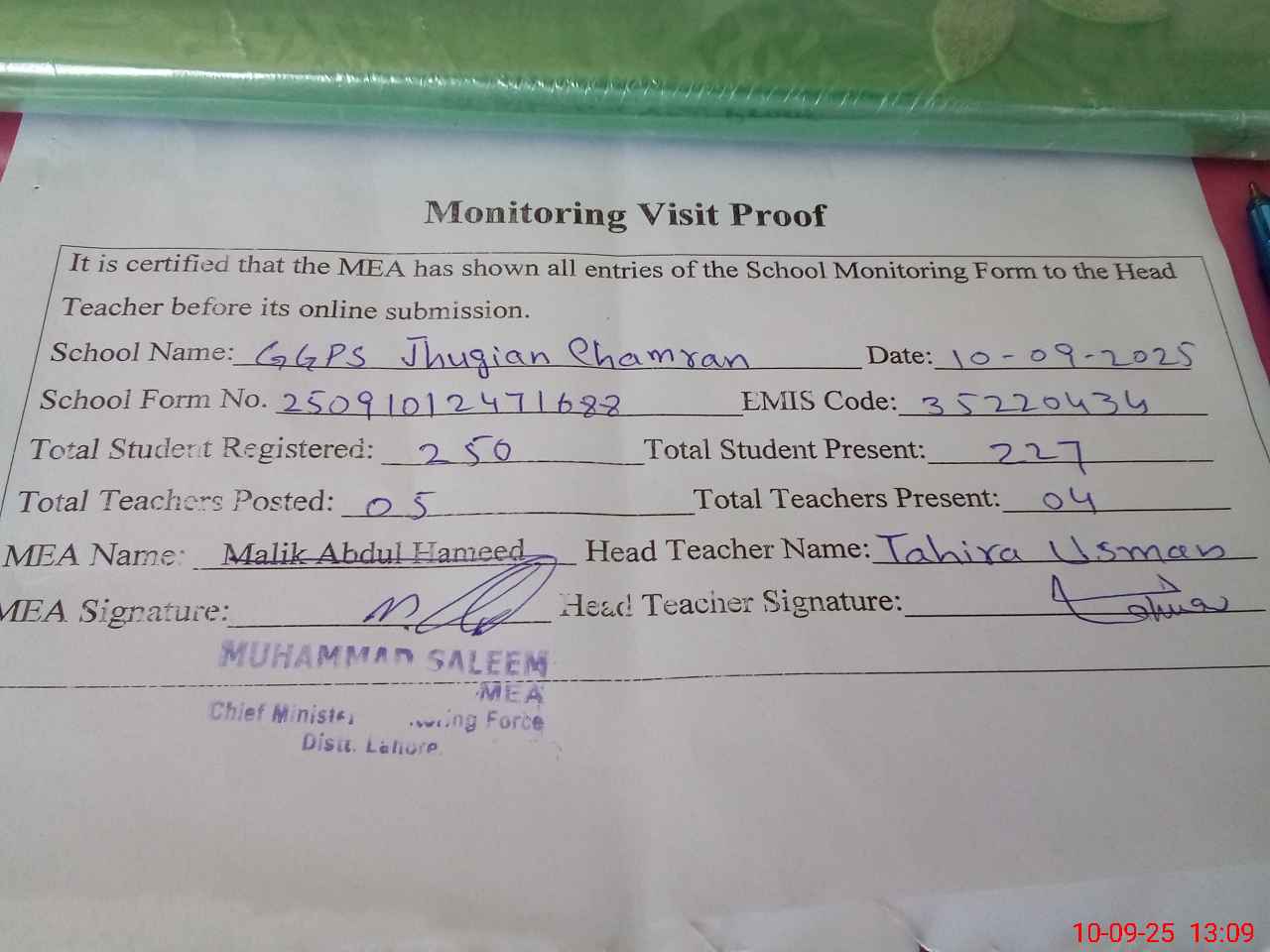 | EMIS Code: 35220434 | Name of School: GGPS JHUGIAN CHAMRAN | |||