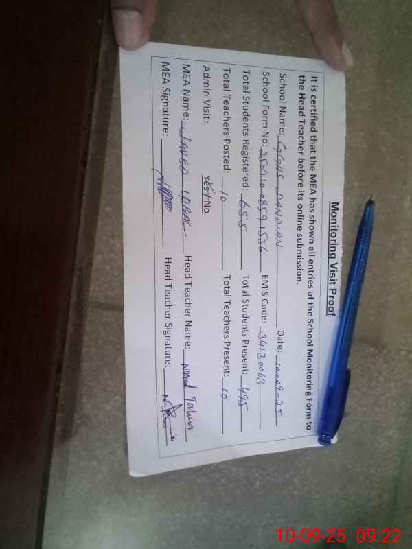 | Remarks (Use Separate Page if Required): School has separate primary portion building of primary portion is dangerous Shabbir Ahmad performs night duty sign of water leakage found at few places found in high building portion | |||||